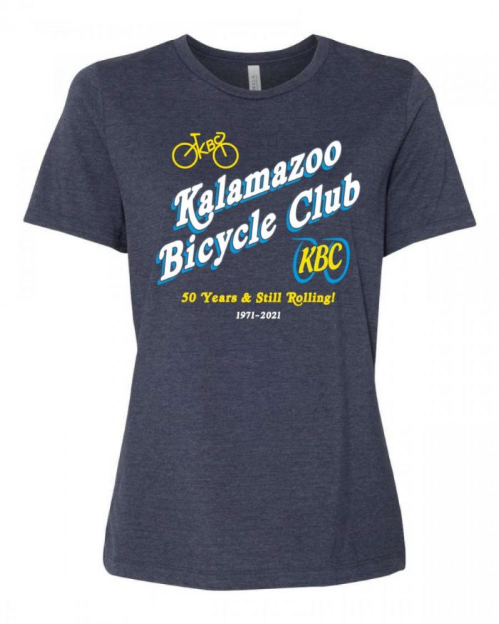 To help celebrate Kalamazoo Bicycle Club’s 50th year, the club has designed a new t-shirt. The white and yellow design on a navy heather t-shirt is offered in both women’s and men’s sizes. You can order it on PureKalamazoo’s website, www.PureKalamazoo.com, Clubs and Nonprofits tab, Kzoo Bicycle Club. The online store will be open through January 31st with t-shirts available by mid-February.